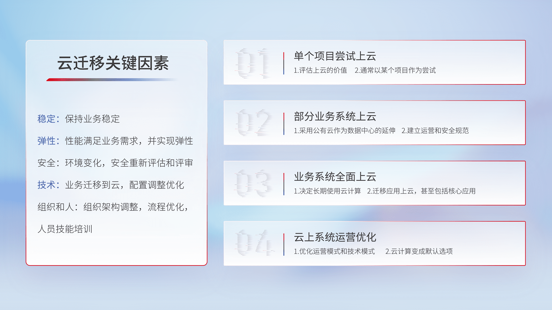 结合实际业务,,从规划设计、、、云平台选型、、云原生改造、、、、数据迁移、、集成交付,,,迁移全过程为客户识别最佳上云路径,,做好风险识别管理,,设计网络架构、、、身份权限、、、安全审计合规、、、操作审计、、、、日志审计、、监控告警策略、、多站点容灾设计等,,,,对云上基础设施进行整体规划,,,,提升IT治理水平,,以满足弹性、、、、高可用、、、高性能的需求。。。